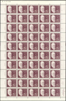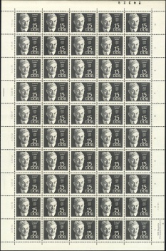 | | Ersttag: | 17.7.1968 | | Abbildung: | Hanns Eisler (1898-1968) | | Zähnung: | K14 | | Druck: | StTdr. | | Farbe: | rotbraun | | Wz: | ohne | | Auflage: | 8.000.000 |