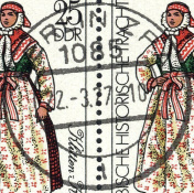 | Nummer: | | SE | | Typ: | Ersttagssonderstempel (ESST) | | Ort/PA: | BERLIN 1085 | | ub: | l | | Inschrift: | SORBISCHE HISTORISCHE TRACHTEN | | Abbildung: | Blumennmuster | | Datum: | 22.-3.77-10 | | Größe: | 39,7mm |