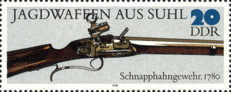 | | Ersttag: | 21.11.1978 | | Abbildung: | Schnapphahngewehr (1780) | | Zähnung: | K14 | | Druck: | Odr. | | Farbe: | mehrfarbig | | Wz: | ohne | | Auflage: | 3.060.000 |