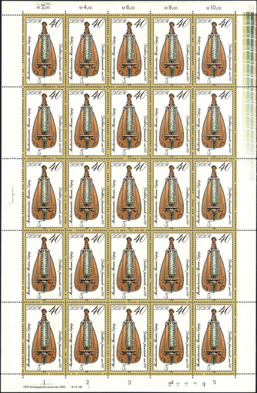 | | Ersttag: | 21.8.1979 | | Abbildung: | Drehleier (Frankreich um 1750) | | Zähnung: | K14 | | Druck: | RaTdr. | | Farbe: | mehrfarbig | | Auflage: | 4.500.000 |