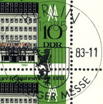 | Nummer: | | SE-10 | | Typ: | Ersttagssonderstempel (ESST) | | Ort/PA: | BERLIN 1085 | | Inschrift: | LEIPZIGER MESSE | | Abbildung: | Wappen von Leipzig | | Datum: | 08.03.83-10 | | Größe: | 34,8mm |