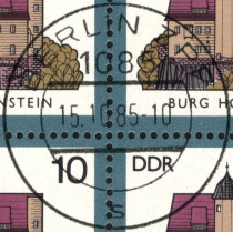 | Nummer: | | SE | | Typ: | Ersttagssonderstempel (ESST) | | Ort/PA: | BERLIN 1085 | | Inschrift: | BURGEN IN DER DDR | | Abbildung: | Burg Goseck | | Datum: | 15.10.85-11 | | Größe: | 34,4mm x 39,1mm |