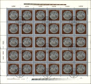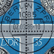 | | Ersttag: | 4.2.1986 | | Abbildung: | Stadttaler Magdeburg (1638) | | Zähnung: | K13 | | Druck: | RaTdr. | | Farbe: | mehrfarbig | | Auflage: | 4.200.000 |
