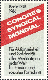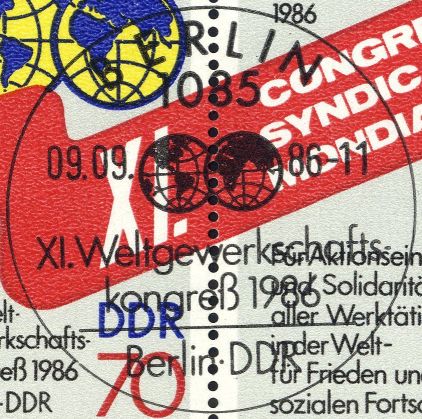 | Nummer: | | SE-10 | | Typ: | Ersttagssonderstempel (ESST) | | Ort/PA: | BERLIN 1085 | | Inschrift: | XI. Weltgewerkschaftskongreß 1986 / Berlin DDR | | Abbildung: | Weltkugel | | Datum: | 09.09.86-10 | | Größe: | 35,6mm | | Bemerkung: | Abstand zwischen den Buchstaben von BERLIN und der Randlinie des Stempels oben: 1,5mm | |