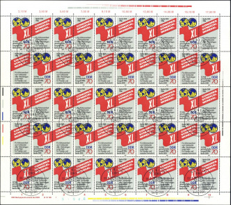 | Nummer: | | SE-11 | | Typ: | Ersttagssonderstempel (ESST) | | Ort/PA: | BERLIN 1085 | | Inschrift: | XI. Weltgewerkschaftskongreß 1986 / Berlin DDR | | Abbildung: | Weltkugel | | Datum: | 09.09.86-11 | | Größe: | 34,8mm | | Bemerkung: | Abstand zwischen den Buchstaben von BERLIN und der Randlinie des Stempels oben: 0,9mm | |