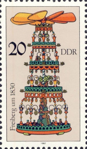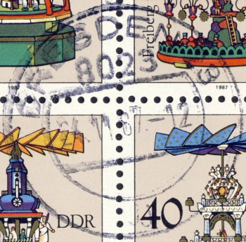 | Ersttag: | 24.11.1987 | Abbildung: | Freiberg (um 1830) | Zähnung: | K12,5:13 | Druck: | Odr. | Farbe: | mehrfarbig | Wz: | ohne | Auflage: | 2.100.000 |