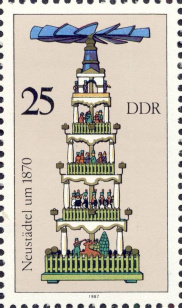 | Ersttag: | 24.11.1987 | Abbildung: | Neustädtel (um 1870) | Zähnung: | K12,5:13 | Druck: | Odr. | Farbe: | mehrfarbig | Wz: | ohne | Auflage: | 2.100.000 |