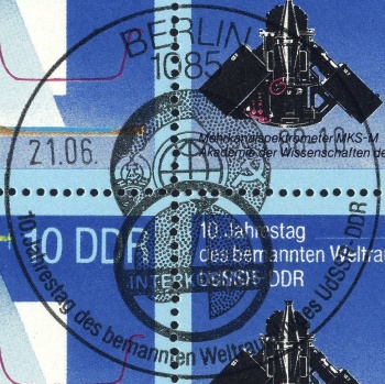 | Nummer: | | SE-10 | | Typ: | Ersttagssonderstempel (ESST) | | Ort/PA: | BERLIN 1085 | | Inschrift: | 10. Jahrestag des bemannten Weltraumfluges UdSSR - DDR | | Abbildung: | Emblem des Interkosmos-Programms sowie Fahnen der DDR und der UdSSR um stilisierte Weltkugel. | | Datum: | 05.07.88-10 | | Größe: | 40,5mm | | Bemerkung: | Dicke Linien und Buchstaben. Schmale Lücke (0,7mm) zwischen "10." (von "10. Jahrestag ...") und Randlinie des Stempels |