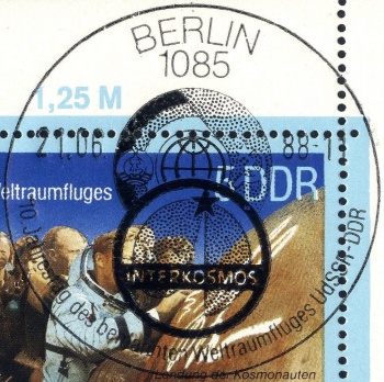 | Nummer: | | SE-11 | | Typ: | Ersttagssonderstempel (ESST) | | Ort/PA: | BERLIN 1085 | | Inschrift: | 10. Jahrestag des bemannten Weltraumfluges UdSSR - DDR | | Abbildung: | Emblem des Interkosmos-Programms sowie Fahnen der DDR und der UdSSR um stilisierte Weltkugel. | | Datum: | 05.07.88-11 | | Größe: | 40,3mm | | Bemerkung: | Feinere Linien und dünnere Buchstaben. Breite Lücke (1,3mm) zwischen "10." (von "10. Jahrestag ...") und Randlinie des Stempels |