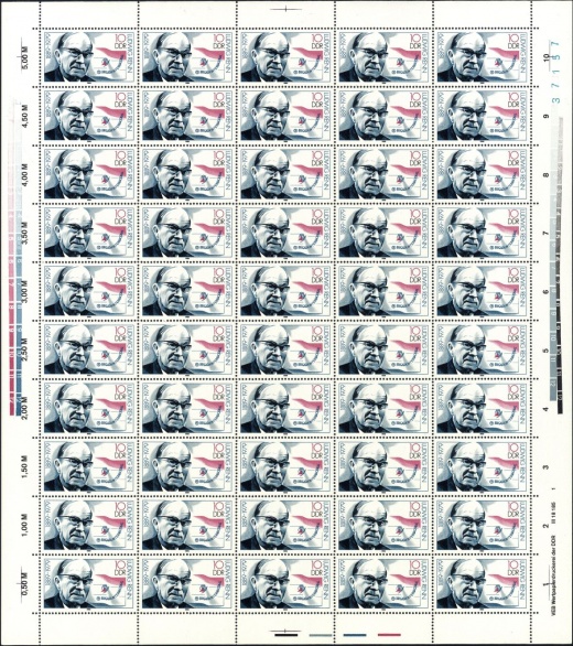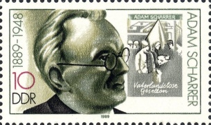 | | Ersttag: | 28.2.1989 | | Abbildung: | Adam Scharrer (1889-1948) | | Zähnung: | K14 | | Druck: | RaTdr. | | Farbe: | mehrfarbig | | Wz: | ohne | | Auflage: | 8.000.000 |