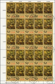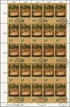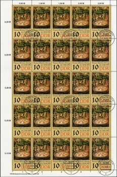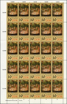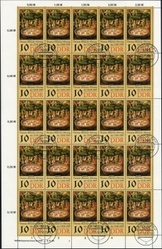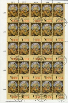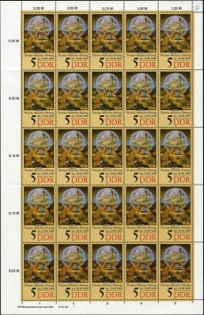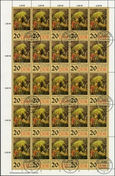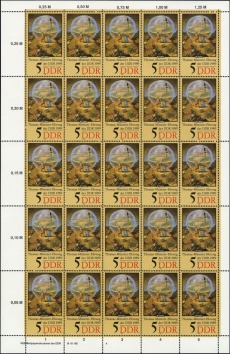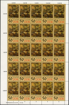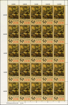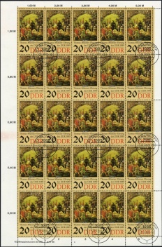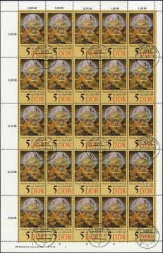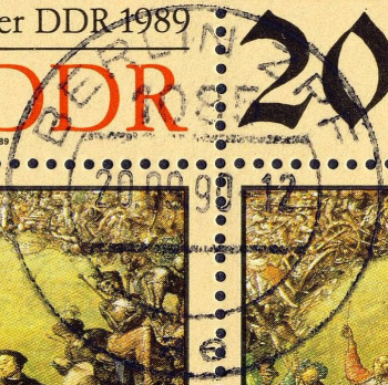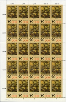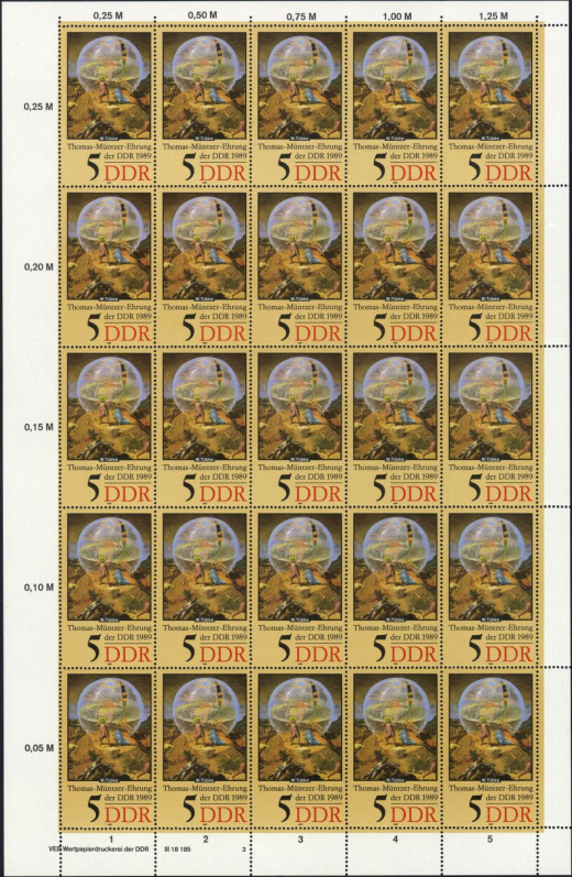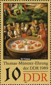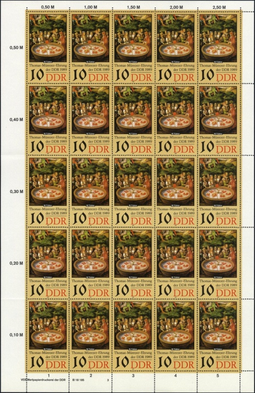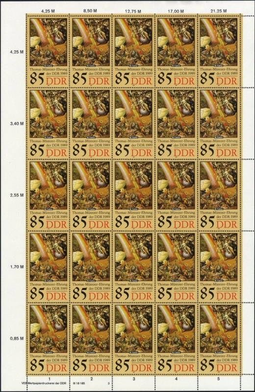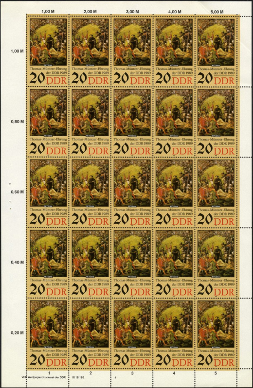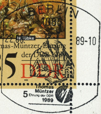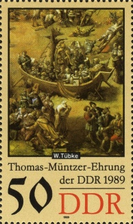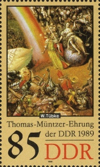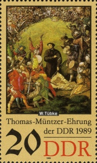 | | Ersttag: | 22.8.1989 | | Abbildung: | Müntzer in der Schlacht | | Zähnung: | K14 | | Druck: | Odr. | | Farbe: | mehrfarbig | | Auflage: | 16.400.000 |