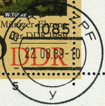 | Nummer: | | SE | | Typ: | Ersttagssonderstempel (ESST) | | Ort/PA: | BERLIN 1085 | | Inschrift: | Thomas Müntzer Ehrung der DDR 1989 | | Abbildung: | Bild von Thomas Müntzer | | Datum: | 22.08.89-10 | | Größe: | 35,0mm x 40,4mm |