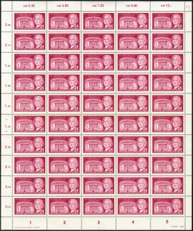 | | Ersttag: | 16.9.1953 | | Abbildung: | Balthasar Neumann, Residenz Würzburg | | Zähnung: | K13:12,5 | | Druck: | RaTdr. | | Farbe: | schwärzlichpreußischblau | | Wz: | 2XI, 2XII (DDR Posthorn) | | Auflage: | 1.200.000 |