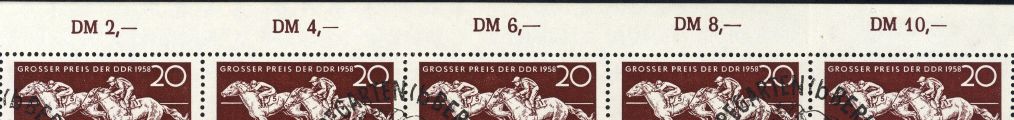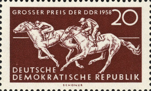 | | Ersttag: | 22.7.1958 | | Abbildung: | Galopprennen | | Zähnung: | K13:12,5 | | Druck: | RaTdr. | | Farbe: | rotbraun | | Wz: | 3X (DDR Kreuzblüten)