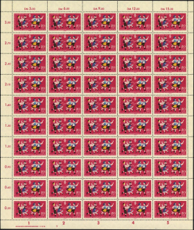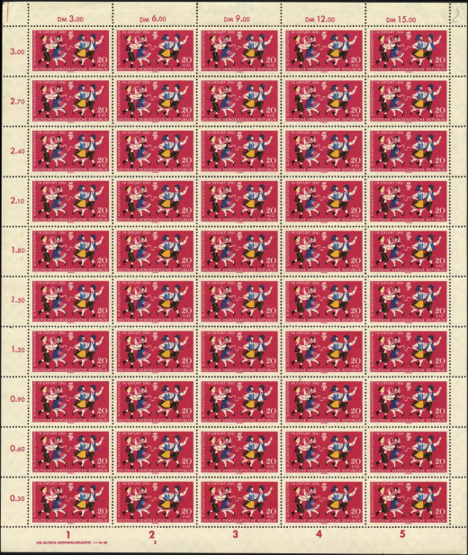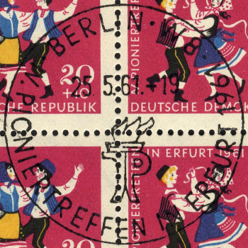 (Zuschlag) | | Ersttag: | 25.5.1961 | | Abbildung: | Junge Pioniere beim Volkstanz | | Zähnung: | K13:12½ | | Druck: | Odr. | | Farbe: | mehrfarbig | | Wz: | 3Y (DDR Kreuzblüten)