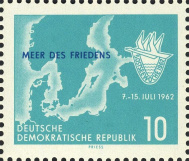 | | Ersttag: | 2.7.1962 | | Abbildung: | Motorschiff "Frieden" (10.020 tdw) im Hafen Rostock | | Zähnung: | K13:13½ | | Druck: | Odr. | | Farbe: | lebhaftkobaltblau/dunkelgraugelb | | Wz: | 3X (DDR Kreuzblüten)