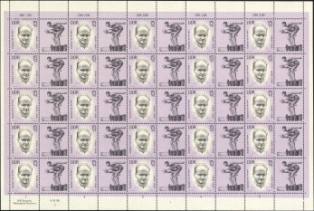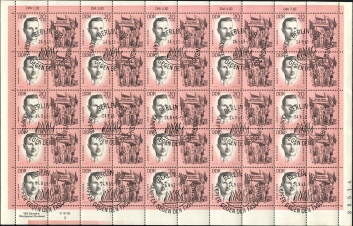 (Zuschlag) | | Ersttag: | 24.9.1963 | | Abbildung: | Kurt Biedermann (1903-1942) | | Zähnung: | K14 | | Druck: | RaTdr./StTdr. | | Farbe: | mattblaugrün/schwarz | | Wz: | 3X (DDR Kreuzblüten)