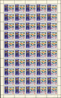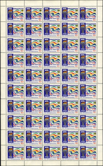 KatNr. 389 (Emblem der jungen Pioniere, mehrfarbiges Wellenmuster, FDJ-Emblem)