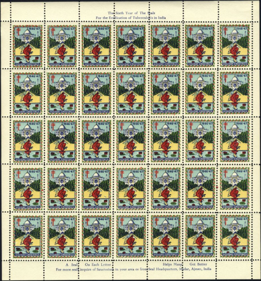 | KatNr.: | | IN-CSC-1946-1 (Green: 7) | | Abbildung: | Indisches Mädchen am Lotus-Teich. Taj Mahal im Hintergrund. | | Schriftzug: | "1946-47" (oben), "HOLIDAY GREETINGS" (unten) | | Zähnung: | L11 | | Druck: | Bdr. | | Farben: | mehrfarbig |
