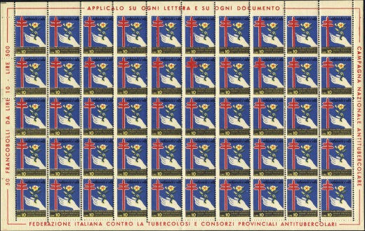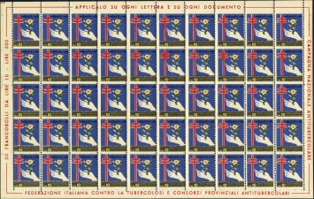 | KatNr.: | | IT-1953-1 (Green: 14) | | Abbildung: | Großes Doppelkreuz Blume in Hand Schriftzug "solidarita e vita" oben, "FEDERAZIONE IT. CONTRA LA TUBERCOLOSI, CONSORZI PROV. ANTITUBERCOLARI, 10 LIRE" unten. | | Zähnung: | L10,5:11,5 | | Druck: | Odr. | | Farben: | rot, gelb, blau, schwarz |