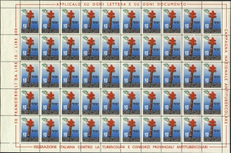 | KatNr.: | | IT-1955-1 (Green: 19) | | Abbildung: | Großes Doppelkreuz mit Rebe und "difendiamo la vita" Schriftzug unten: "FEDERAZIONE ITALIANA CONTRO LA TUBERCOLOSI - CONSORZI PROVINCIALI ANTITUBERCOLARI" und "10 LIRE". | | Zähnung: | L11,75 | | Druck: | Odr. | | Farben: | rot, blau, grün, schwarz |