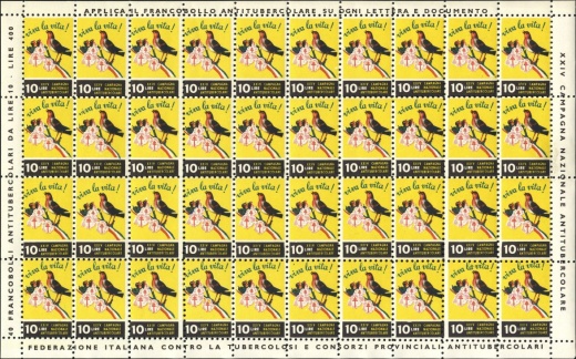 | KatNr.: | | IT-1961-1 (Green: 25.1) | | Abbildung: | Vogel mit Jungen im Nest und Schritzug "viva la vita!" Schriftzug unten "XXIV CAMPAGNA NAZIONALE ANTITUBERCOLARE" und "10 LIRE". | | Zähnung: | L9 | | Druck: | Odr. | | Farben: | grün, rot, gelb, schwarz |