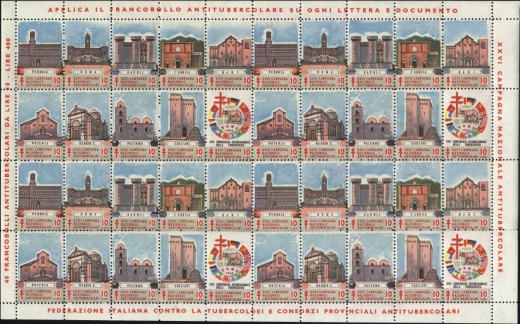 Alle Marken haben unten folgende Inschrift: "XXVI CAMPAGNA NAZIONALE ANTITUBERCOLARE" und "10 LIRE"