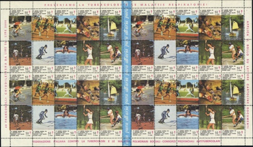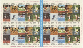 Alle Marken haben unten folgende Inschriften: "41° CAMPAGNA NAZIONALE PER LA PREVENZIONE DELLA TUBERCOLOSI E DELLE MALATTIE POLMONARI SOCIALI" und "50 LIRE"