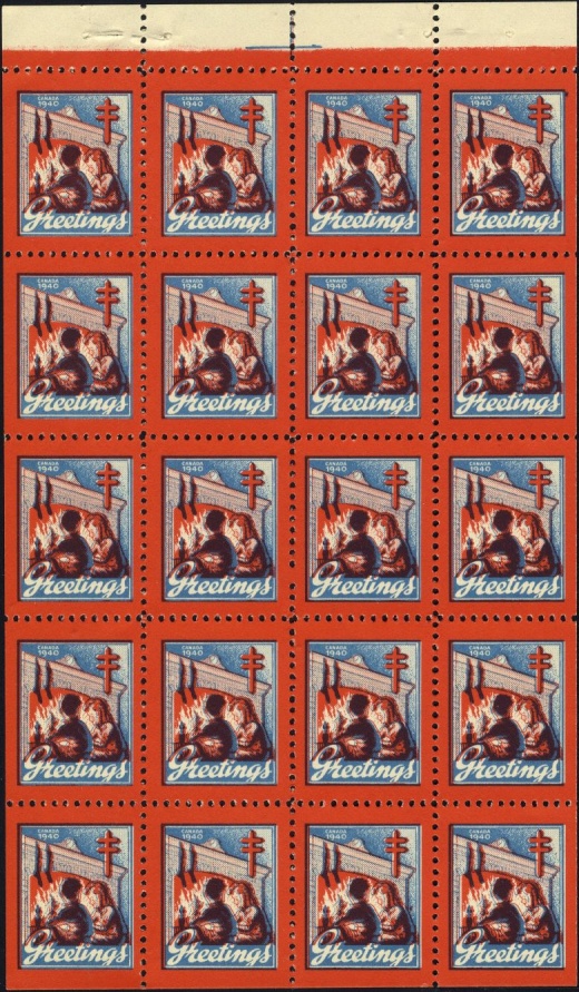 | KatNr.: | | CA-1940-1 (Green: 27) | | Abbildung: | Zwei Kinder am Kamin. | | Schriftzug: | "CANADA 1940" oben und "Greetings" unten. | | Zähnung: | L12,5 | | Druck: | Bdr. | | Farben: | blau, rot |