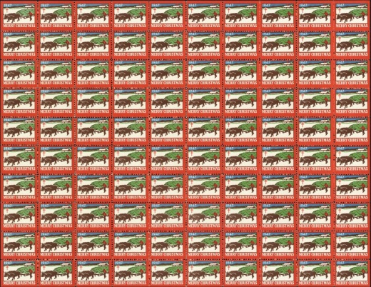 | KatNr.: | | CA-1947-1 (Green: 41) | | Abbildung: | Halzfälle mit Fuhre Bäumen und Ochsengespann. | | Schriftzug: | "1947" oben und "MERRY CHRISTMAS" unten. | | Zähnung: | L12,5 | | Druck: | Odr. | | Farben: | blau, rot, gelb, grün |
