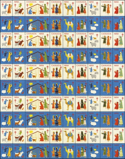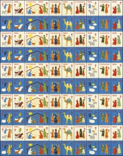 | KatNr.: | | CA-1959-1 (Green: 58) | | Abbildung: | Maria mit Jesuskind im Stall | | Schriftzug: | "CANADA 1959" oben. | | Zähnung: | L12,5 | | Druck: | Odr. | | Farben: | rot, gelb, blau, orange, grün, braun, schwarz |