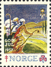 | KatNr.: | | NO-1957-1 (Green: 54.1) | | Abbildung: | Hirten blicken zum Weihnachtsstern | | Schriftzug: | "GOD JUL 1957" (oben), "NORGE" (unten) | | Zähnung: | L11 | | Druck: | Odr. | | Farben: | blau, gold, rot | | Auflage: | ? |